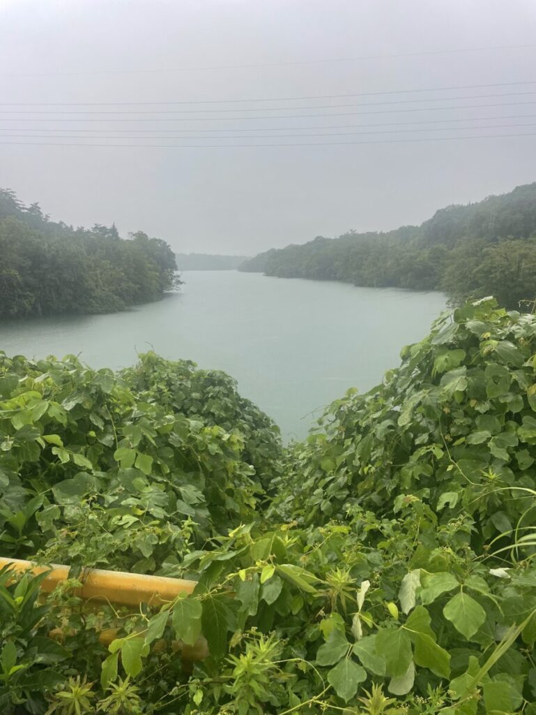 丸山の湖、大雨の直後、渡歩道の下流側です。