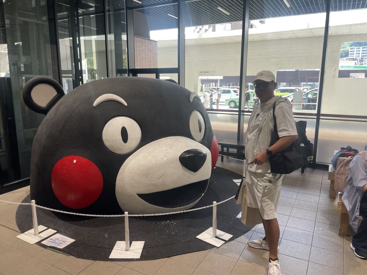 代表のヤマモトです。くまモンの顔!熊本駅です。息子ちゃんが熊本で4年の下宿を終わらせて旅...